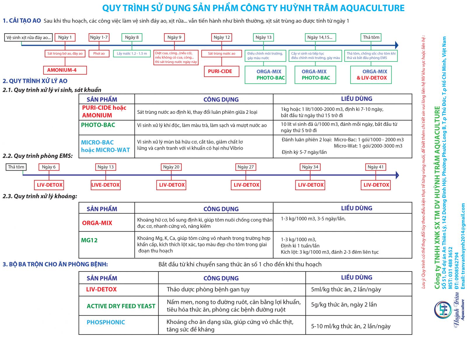 Lưu ý: Trên đây là quy trình cơ bản trong việc xử lý các sản phẩm công ty Huỳnh Trâm Aquaculture, cụ thể từng loại ao khác nhau sẽ có sự điều chỉnh cho phù hợp. Để biết được thông tin chi tiết xin quý khách vui lòng liên hệ công ty để được hướng dẫn